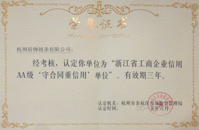 日前,杭州盾牌鏈條有限公司被杭州市余杭區(qū)市場監(jiān)督管理局認定為2015年度“浙江省工商企業(yè)信用AA級‘守合同重信用’單位”。這是盾牌公司長期以來樹立“守合同,重信用”的理念,在經(jīng)營中誠信守約、合法經(jīng)營獲得的殊榮。