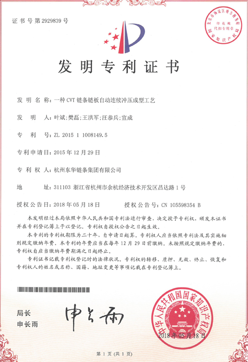 另,2019年12月,集團知識產權管理體系順利通過中知(北京)認證有限公司的年度監督審核,進一步證實了集團公司知識產權管理體系運行有效性。同時,《2019年度浙江省專利項目績效評價(專利獎)結果公示》,集團公司“一種CVT鏈條鏈板自動連續沖壓成型工藝”發明專利榮獲浙江省專利優秀獎。