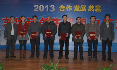 最后,內(nèi)銷公司總經(jīng)理戴迪漢分別宣讀了東華集團(tuán)和盾牌公司2012年優(yōu)秀經(jīng)銷商名單,宣碧華董事長向優(yōu)秀經(jīng)銷商頒發(fā)了榮譽(yù)證書并合影留戀。
