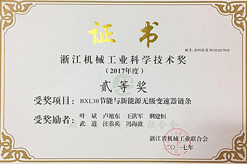 又訊:日前,公司生產的BXL30節能與新能源無級變速器鏈條被浙江省機械工業聯合會評為“浙江機械工業科學技術獎貳等獎”。