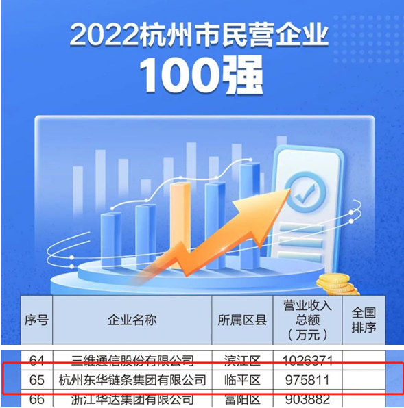 東華鏈條集團分別榮登“2022杭州市民營企業100強”第65位;“ 2022杭州市民營企業制造業50強”第34位;“2022杭州市民營企業就業50強”第43位;“2022杭州市民營企業研發投入50強”第46位。其中,“2022杭州市民營企業100強”入圍門檻為33.68億元,有41家企業入選“2022中國民營企業500強”。