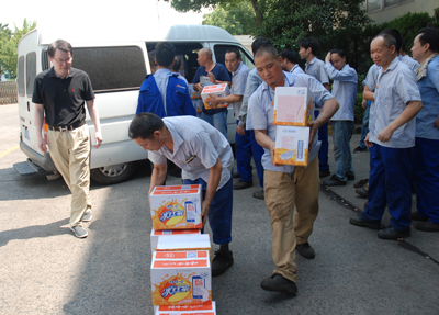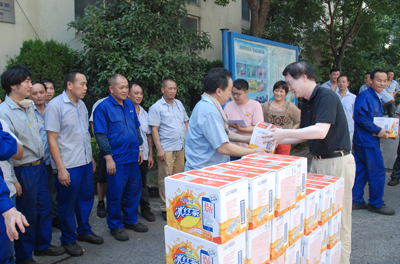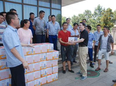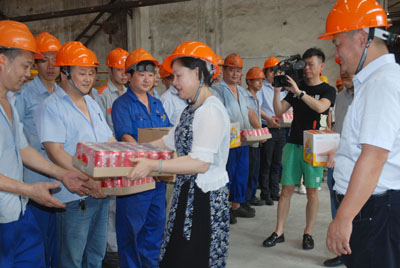 7月27日下午,由公司工會主席魯小林帶隊,對公司各區域室外作業、高溫作業員工進行慰問,向大家送去了慰問品。每到一個慰問區域,魯主席都代表公司感謝大家為公司的發展付出的辛勤勞動,并叮囑大家注意防暑降溫。