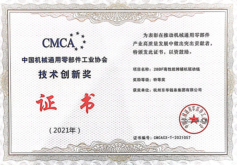 東華鏈條榮獲特等獎(jiǎng)、優(yōu)秀獎(jiǎng)各5項(xiàng)。5項(xiàng)特等獎(jiǎng)分別是:東華鏈條集團(tuán)開(kāi)發(fā)的28BF高性能攤鋪機(jī)驅(qū)動(dòng)鏈、東華興化公司開(kāi)發(fā)的32BSPF高精度高耐磨鏈條、盾牌公司開(kāi)發(fā)的P224.7F1驅(qū)動(dòng)輸送鏈和M224F-S-250地拖輸送鏈、自強(qiáng)公司開(kāi)發(fā)的C-24SSLR自潤(rùn)滑梯級(jí)鏈條;5項(xiàng)優(yōu)秀獎(jiǎng)產(chǎn)品及高端裝備分別是:東華鏈條集團(tuán)開(kāi)發(fā)的2.0T汽車(chē)發(fā)動(dòng)機(jī)用靜音鏈條、東華興化公司開(kāi)發(fā)的C2062HSSGR高耐磨輸送鏈、盾牌公司開(kāi)發(fā)的P200F280K2輸送鏈、HB50.5F41空心銷軸鏈條鉚頭機(jī)和PO152F48棕櫚油輸送鏈裝配機(jī)。