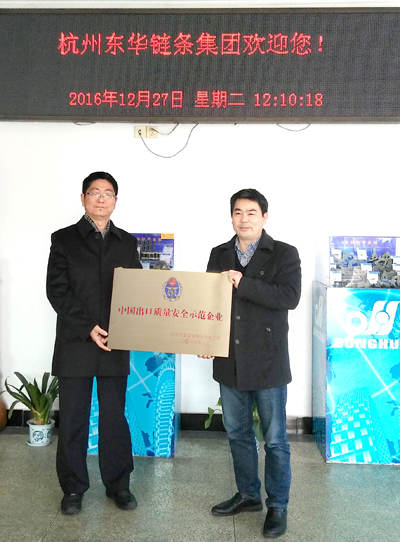 12月27日,杭州出入境檢驗(yàn)檢疫局檢驗(yàn)監(jiān)管處何處長(zhǎng)與機(jī)械科科長(zhǎng)一行赴東華集團(tuán),代表國(guó)家質(zhì)檢總局為我集團(tuán)授予“中國(guó)出口質(zhì)量安全示范企業(yè)”獎(jiǎng)牌。集團(tuán)副總經(jīng)理袁立華等高層參加了授牌儀式。